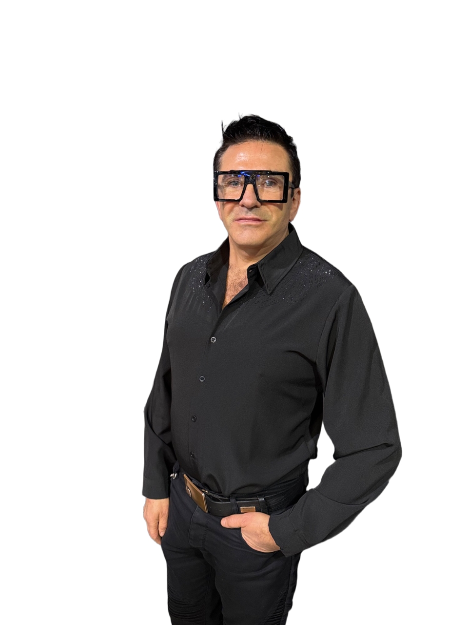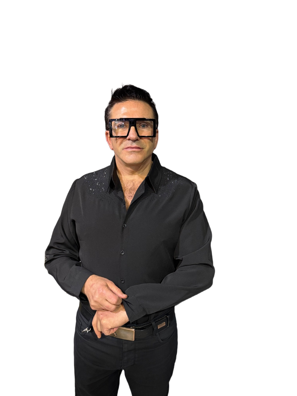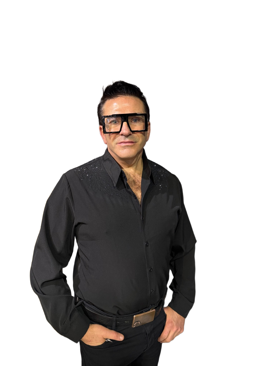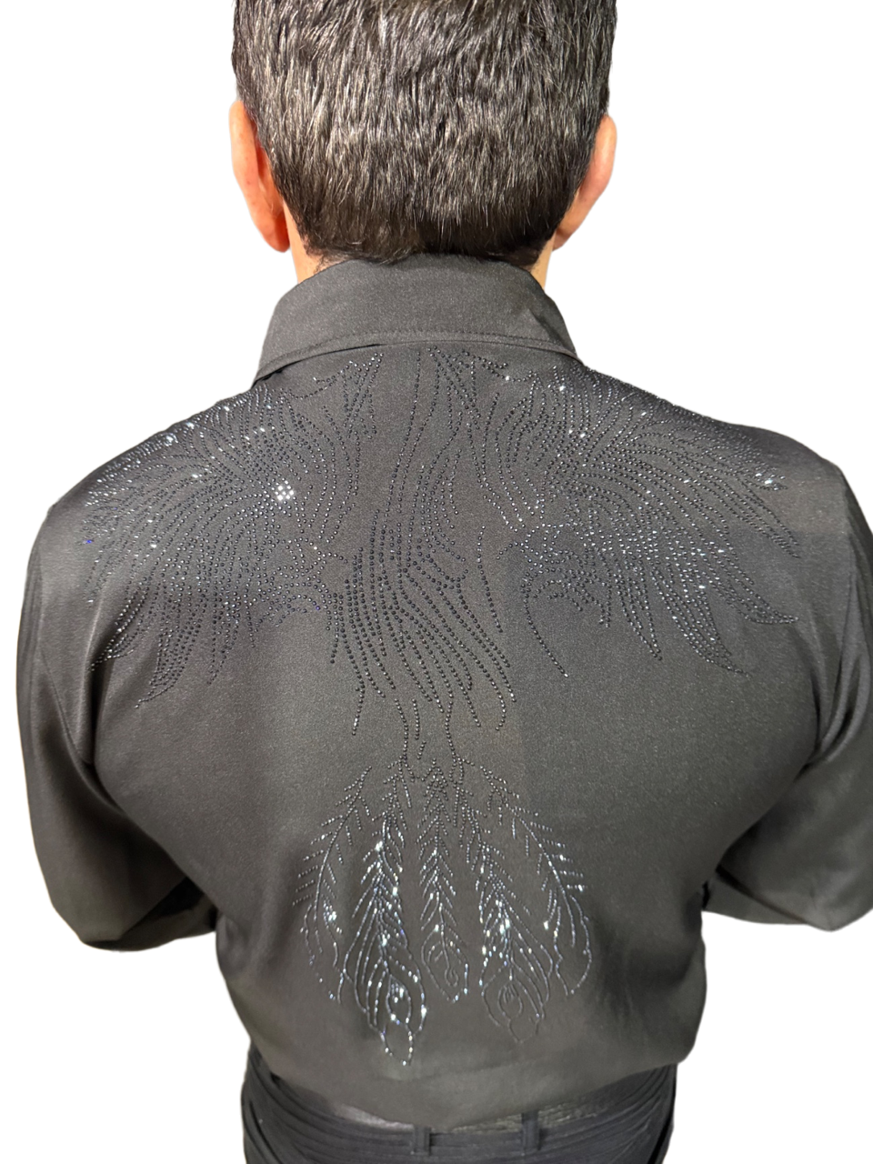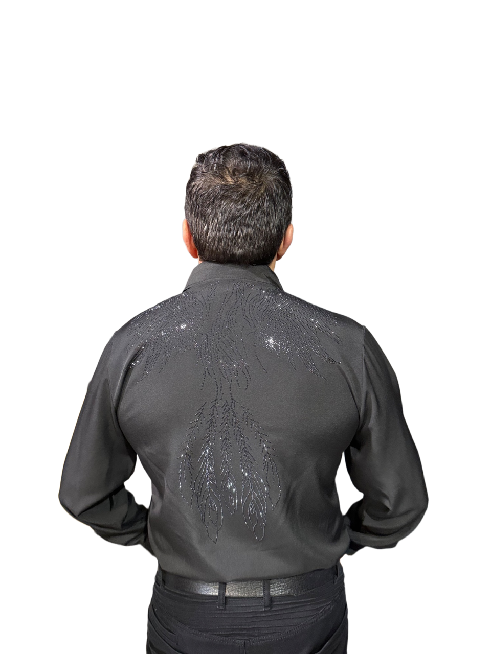 Miesten Musta pitkähihainen napitettava kauluspaita hopea kiiltävä kuviolla.
