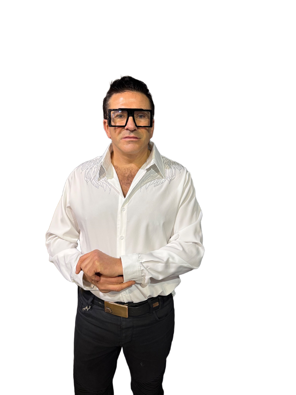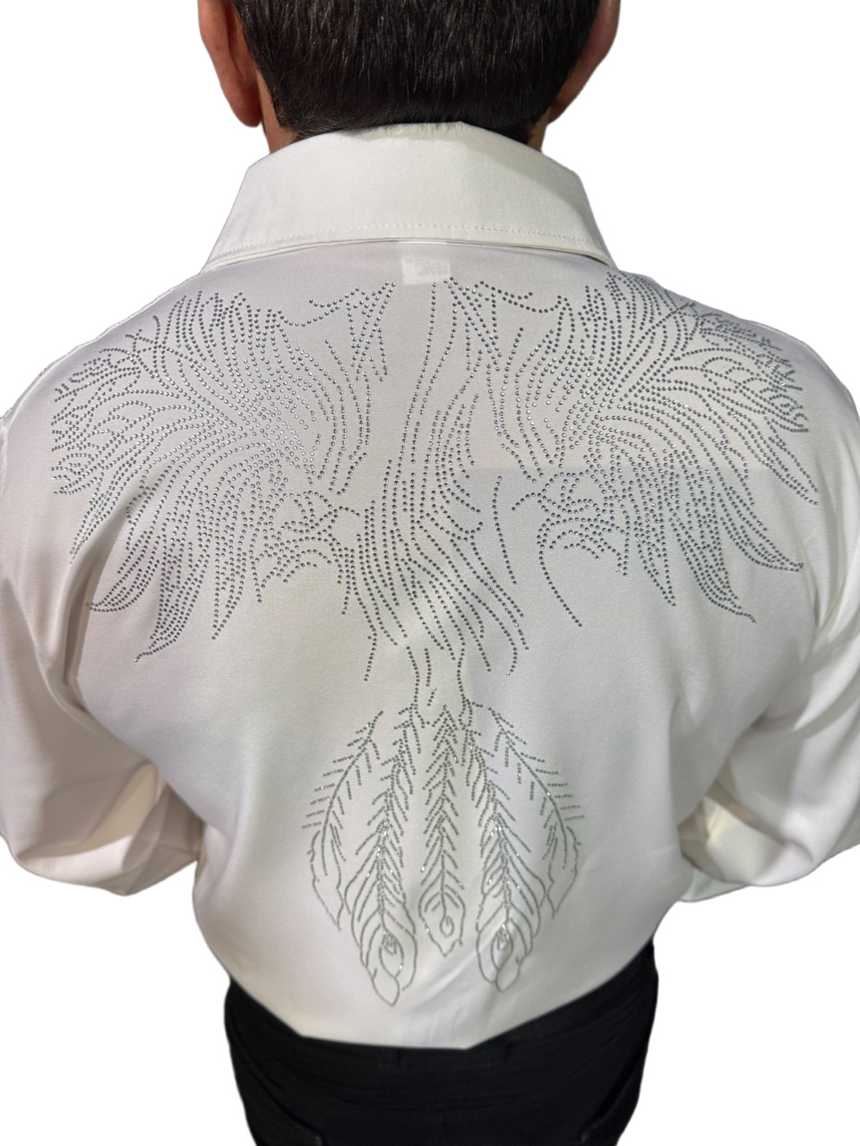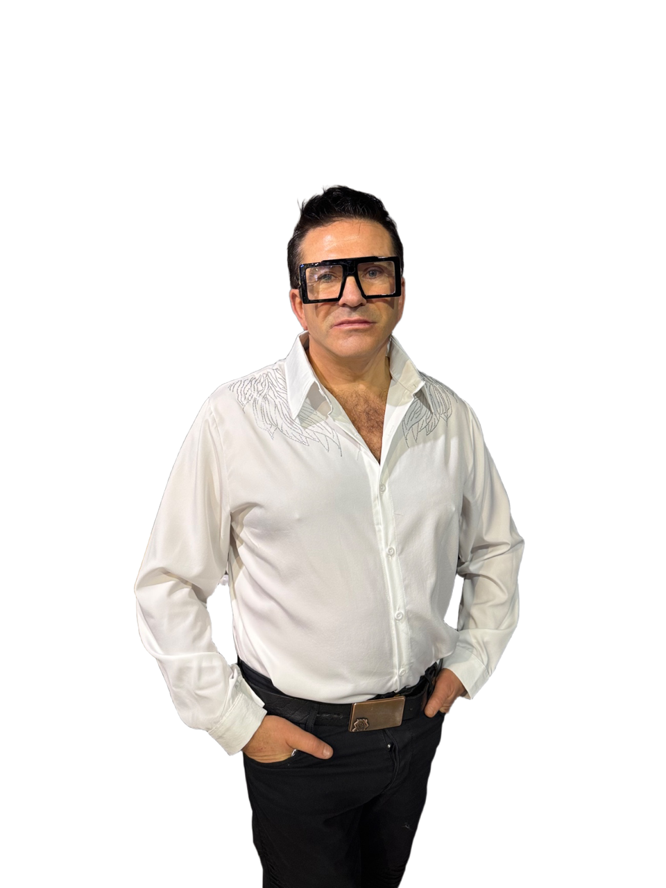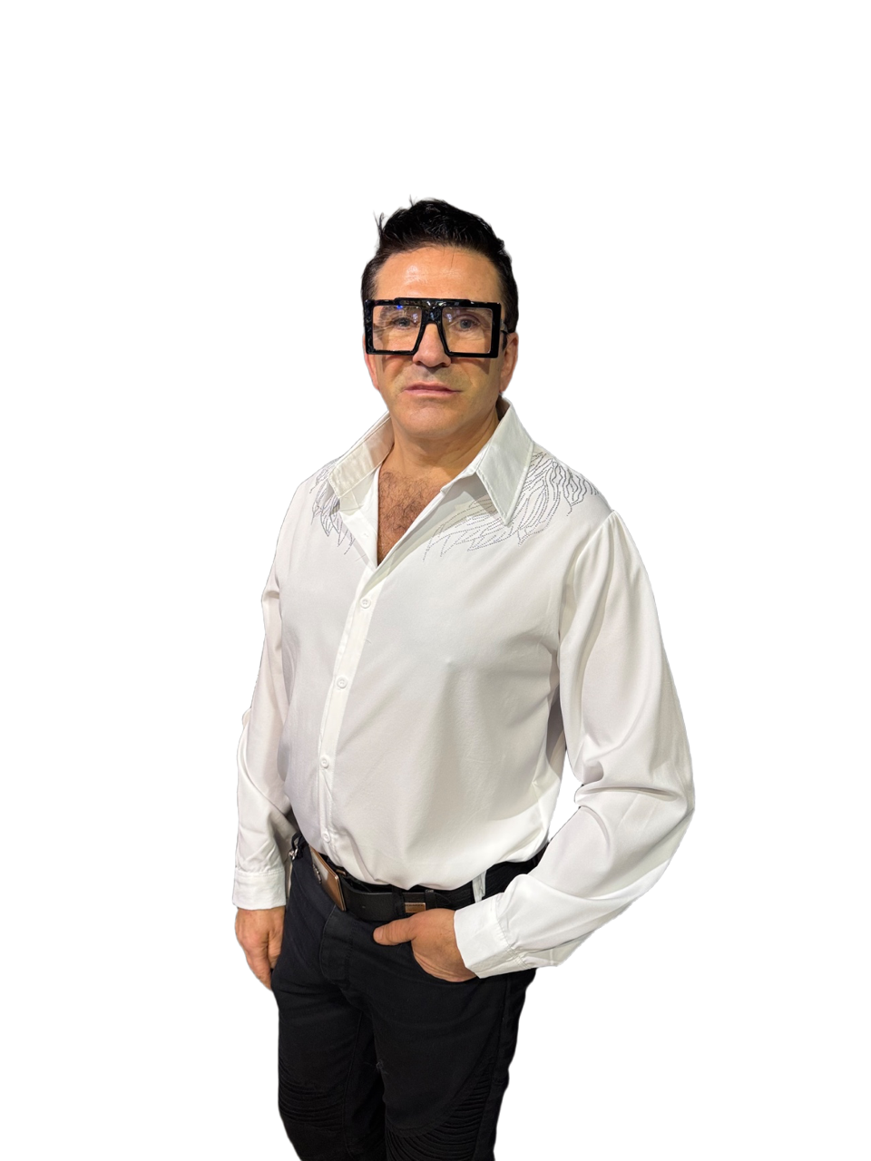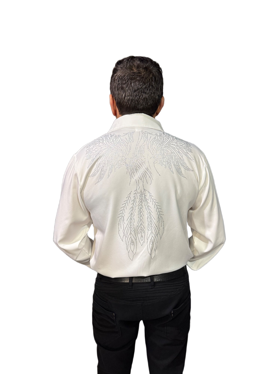 Miesten Musta pitkähihainen napitettava kauluspaita hopea kiiltävä kuviolla.