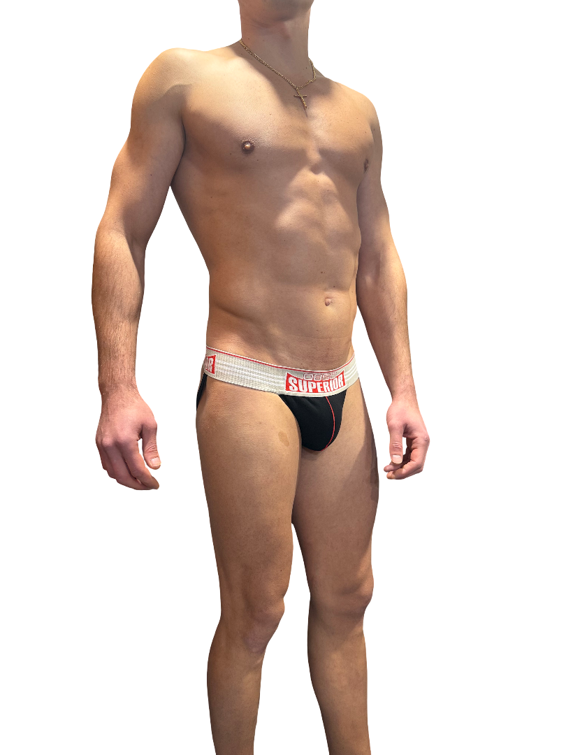 Miesten seksikkäät mustat OBSO SUPERIOR- jockstrap teksti resorilla.