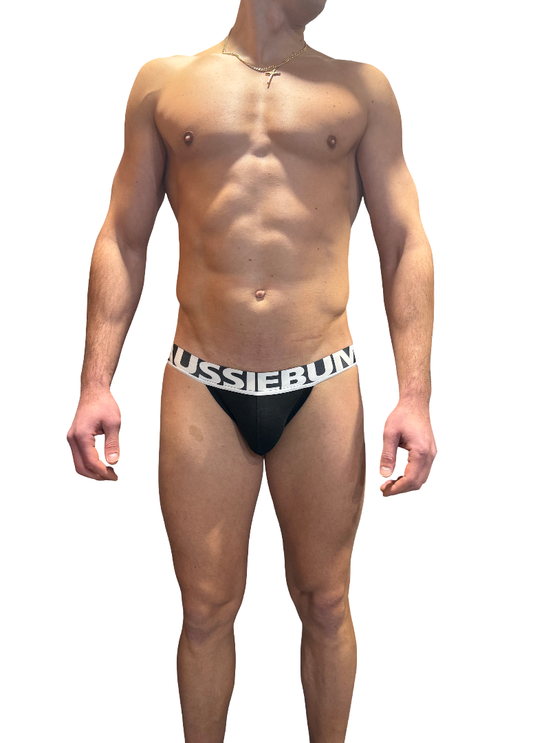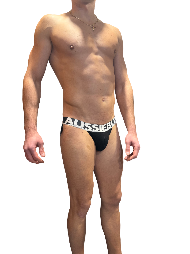 Miesten seksikkäät mustat AUSSIBUM- jockstrap teksti resorilla.