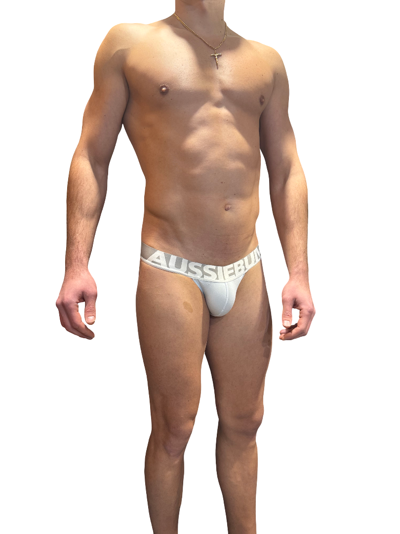Miesten seksikkäät valkoiset AUSSIBUM- jockstrap teksti resorilla.