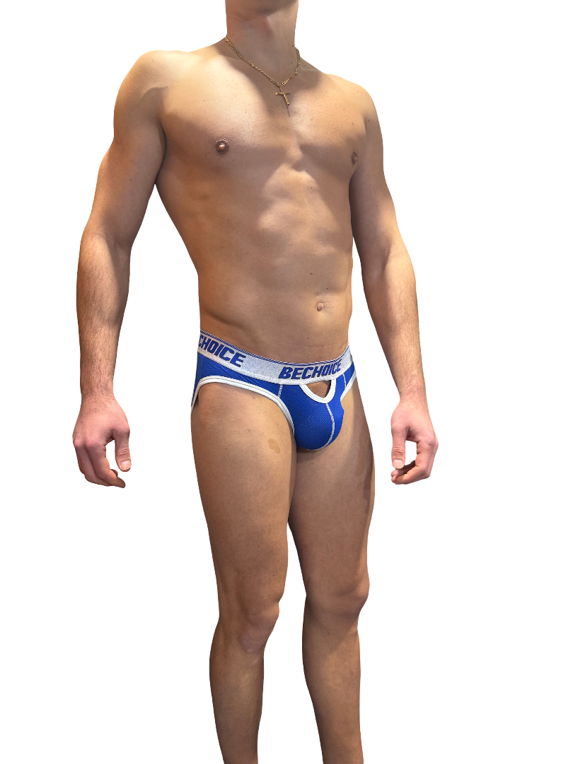 Miesten seksikkäät siniset BECHOICE- jockstrap teksti resorilla.