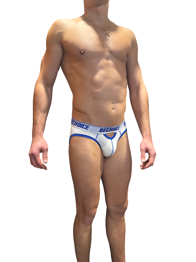 Miesten seksikkäät valkoinen BECHOICE- jockstrap teksti resorilla.